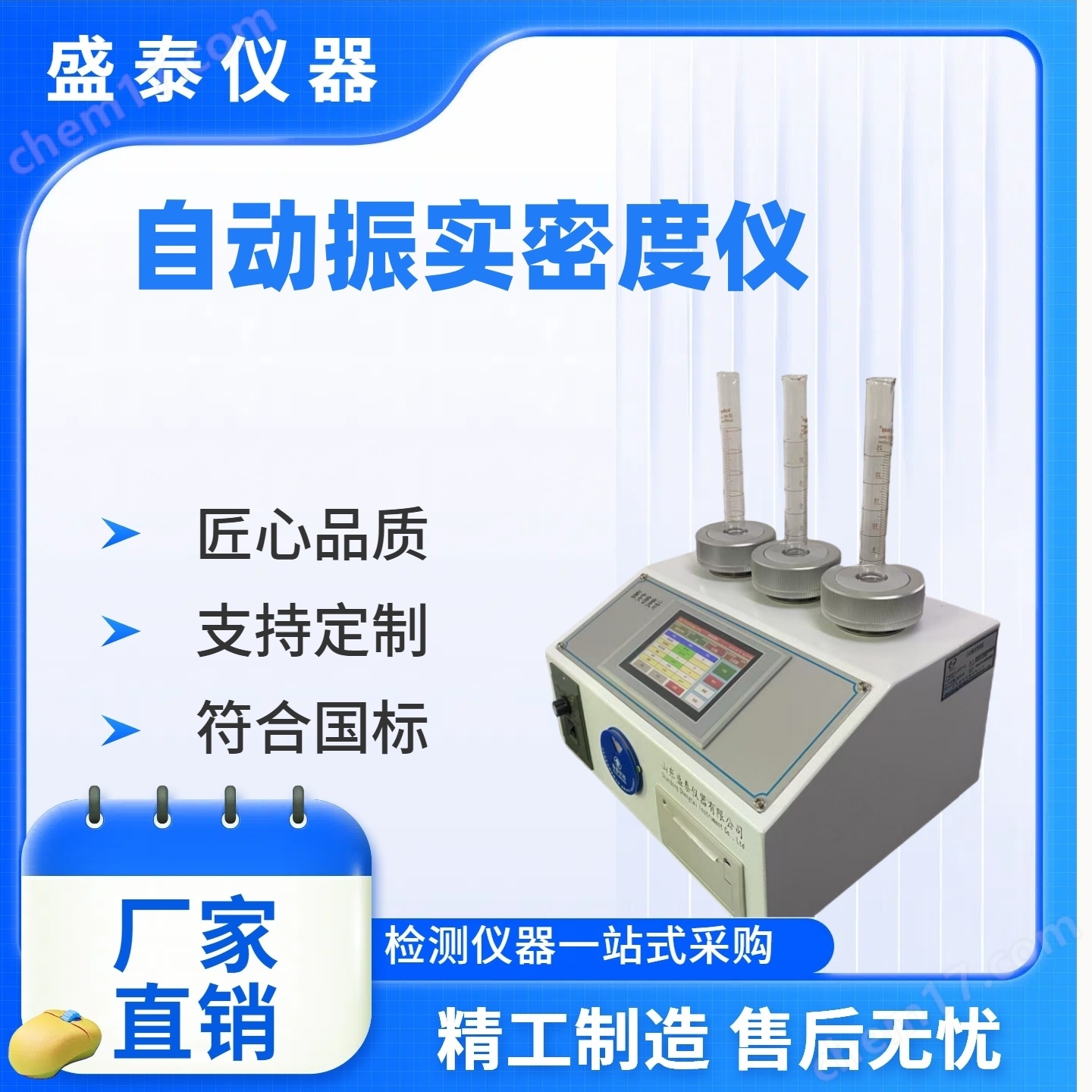 工作原理:振實(shí)密度測(cè)試儀的是將粉末量筒固定在機(jī)械振動(dòng)裝置上,振動(dòng)電機(jī)帶動(dòng)機(jī)械振動(dòng)裝置上下振動(dòng),裝有粉末的刻度試管隨機(jī)械振動(dòng)裝置而發(fā)生有節(jié)拍的振動(dòng),隨著振動(dòng)次數(shù)的增加,量筒里的粉末逐漸振實(shí),振動(dòng)次數(shù)達(dá)到設(shè)定的次數(shù)后,機(jī)械振動(dòng)裝置停止振動(dòng),讀出刻度試管的體積,根據(jù)密度的定義:質(zhì)量除以體積、從而求出振實(shí)后的粉末密度。