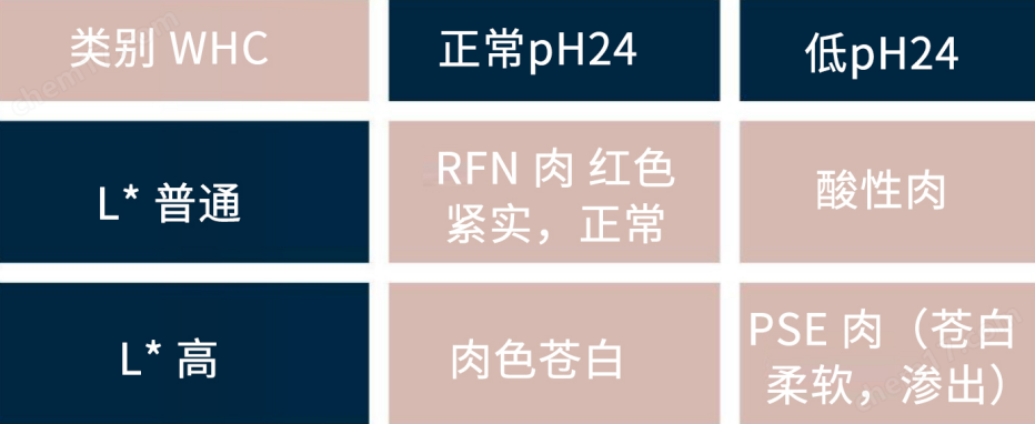 持水能力(WHC) 是與干腌產(chǎn)品密切相關(guān)的內(nèi)在肉質(zhì)參數(shù),WHC-DFD過(guò)高的肉類(lèi)容易受到細(xì)菌污染出現(xiàn)磷酸鹽晶體和糊狀質(zhì)地,而WHC-PSE較差的肉類(lèi)容易出現(xiàn)硝化紅環(huán)、白膜和糊狀等品質(zhì)缺陷。